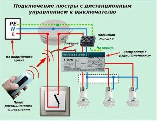 При установке такой люстры выключатель будет выполнять только функцию подачи напряжения на контроллер, который укрыт за декоративной чашкой осветительного прибора. Самый распространённый тип его связи с пультом – радиоканал.