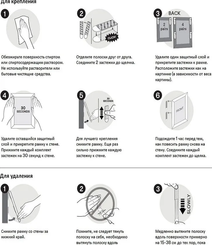 Особые липучки, называемые устройством Command напоминают двусторонний скотч. Но только они двусоставные — на одной части липкий состав на клею, а противоположная с липучкой. Одна присоединяется к стене, а другая фиксируется на раме.
