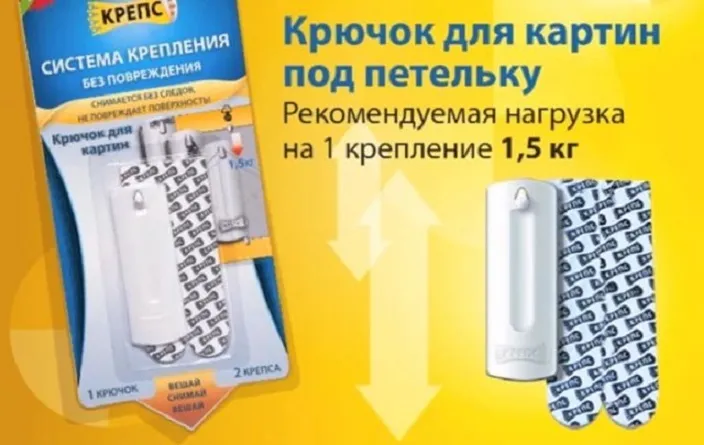 Никаких следов, пятен и повреждений, в отличие от двустороннего скотча. «Крепс» подойдет для картин, вешающихся на веревки или тросики. Один такой крючок выдерживает до 1, 5 кг.