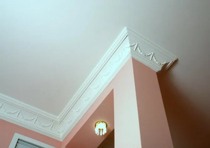Универсальный пенополистирол – наиболее «коммуникабельный» плинтус и для гипсовых потолков, и для пластиковых, закрепленный на клей или на гипсовый раствор.