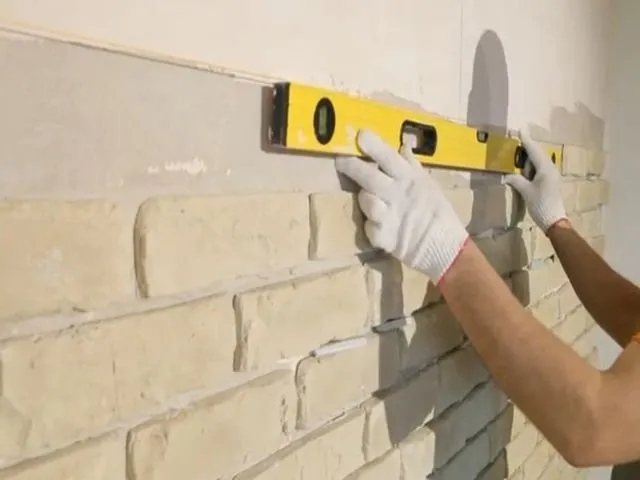 - Для начала нужно выровнять поверхность, на которую будет крепиться отделочный материал. Это позволит значительно упростить отделочные работы и обеспечить качественный монтаж камня. В процессе работы может возникнуть потребность в порезке камня. Для этого используют специальные инструменты или обычную болгарку;
