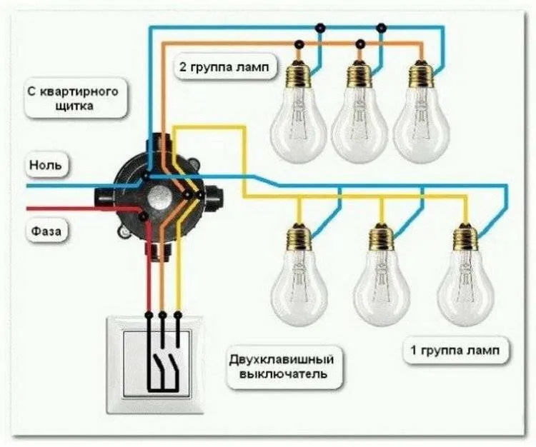 Как подключить люстру на 3 лампочки к двойному выключателю