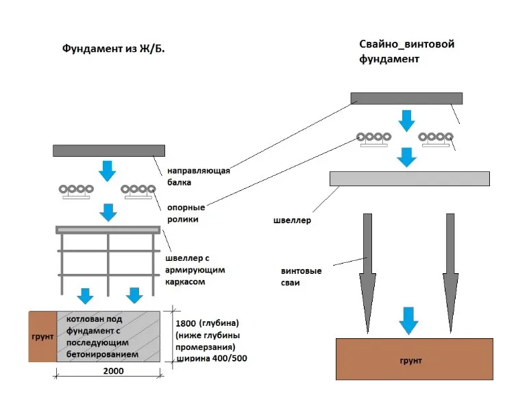 сваям или выпускам арматуры приваривают швеллер № 20 или два параллельных швеллера № 10 и № 14. Их укладывают вплотную к столбу, длина профиля равна 1/2 ширине проема. Верх конструкции должен располагаться на нулевой отметке. Впоследствии к швеллеру будут крепиться 2 регулировочные площадки и 2 роликовые опоры.